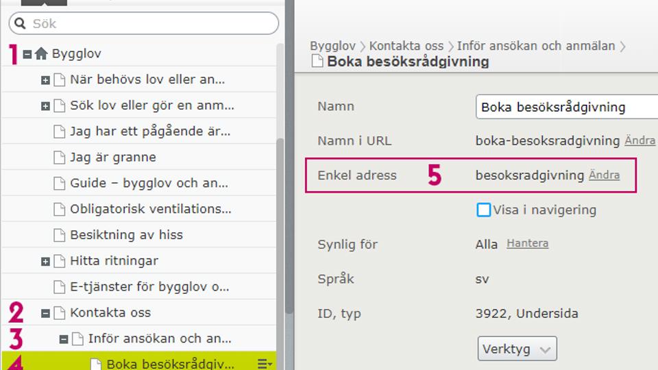 Du kan vid punkt 5 i toppbilden skriva in en enkel adress. Den enkla adressen måste vara unik för webbplatsen. Du kan inte använda ÅÄÖ eller andra konstiga tecken i en enkel adress.