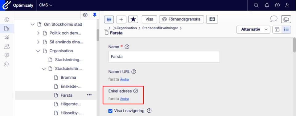 En enkel adress är både tydligare och lättare att komma ihåg. Här har webbredaktören skapat den enkla adressen ”farsta”. Sidan får då ytterligare en (mycket kortare) adress: start.stockholm/farsta. Både den ordinarie och den enkla adressen fungerar.