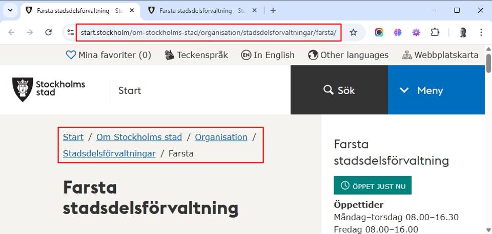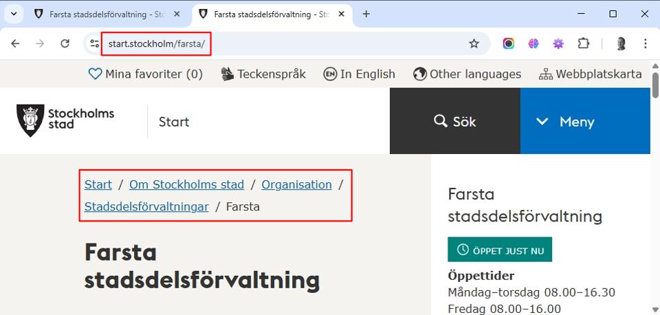 start.stockholm/om-stockholms-stad/organisation/stadsdelsforvaltningar/farsta är alldeles för lång för att tryckas i en broschyr eller sägas i telefon. För att få en kortare adress kan du fylla i ”Enkel adress” på den aktuella sidan.