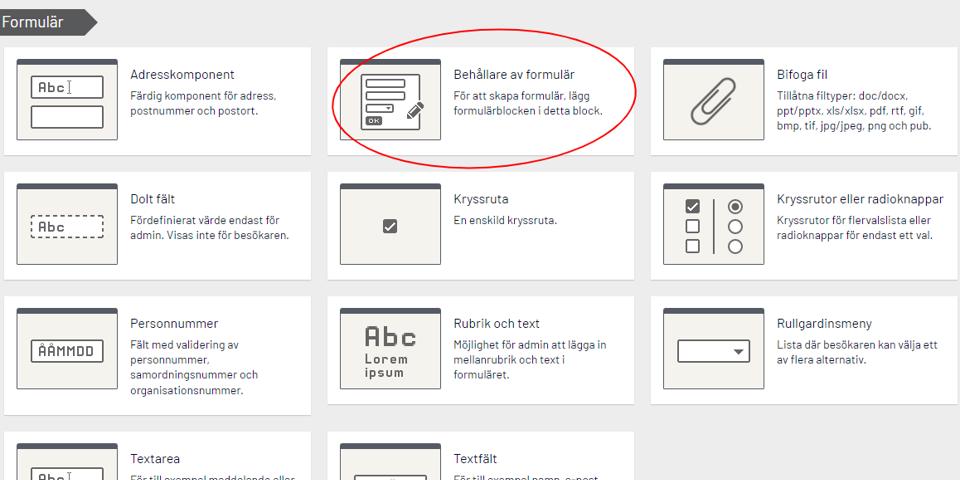 Grunden i formulär består av blocket Behållare av formulär, inringat i bilden ovan. I behållarblocket lägger du olika typer av formulärblock för till exempel textfält eller radioknappar.
